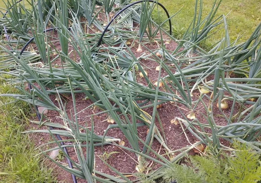 Each type of onion has a different time to maturity, but the whole patch of one variety will “fall over” at about the same time.