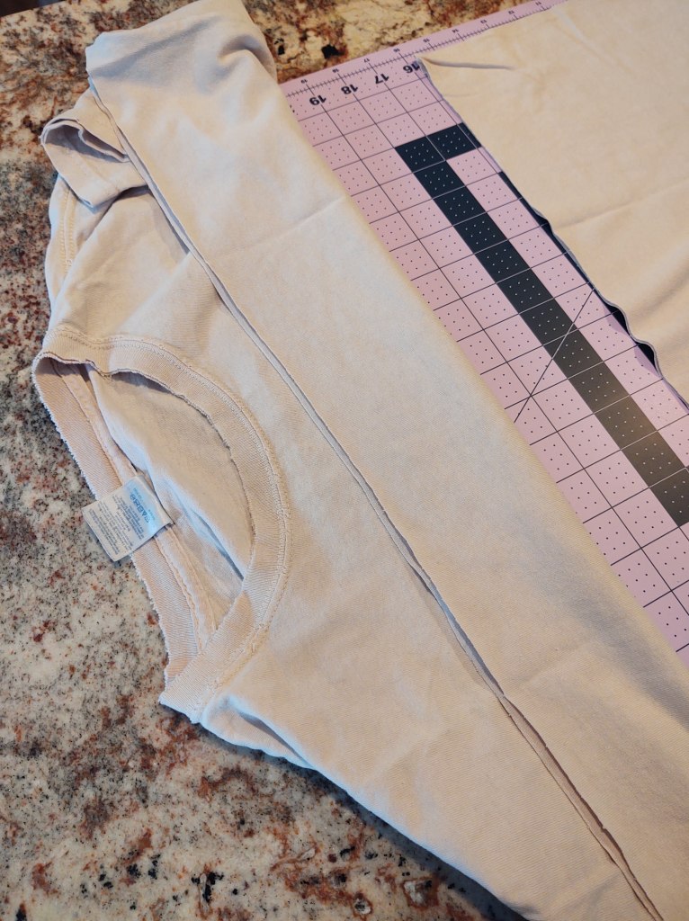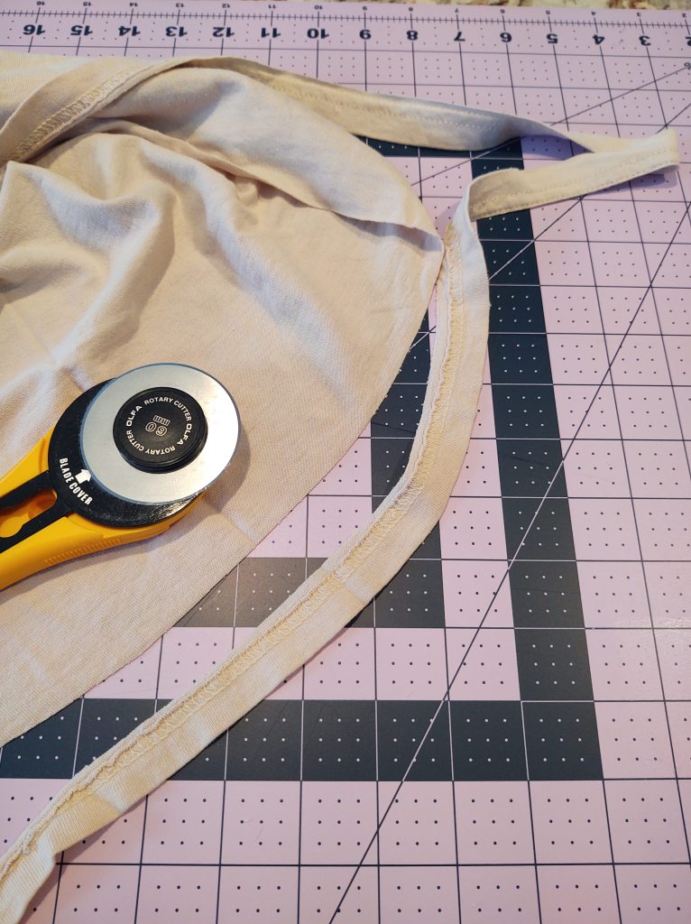 Lay shirt on cutting pad and cut straight across under the armpits. Discard the top of the shirt