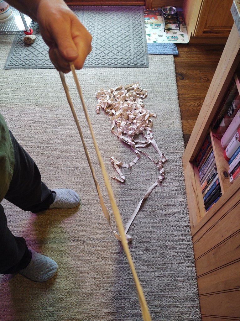 This will stretch the material out a bit and also make it more like a rope than a flat piece of fabric.