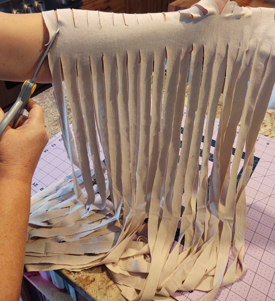 Now, cut one inch strips through the 4 layers of fabric, just past where the bottom meets the top and it transitions to 2 layers, but not all the way to the top or you will have many separate small strips.